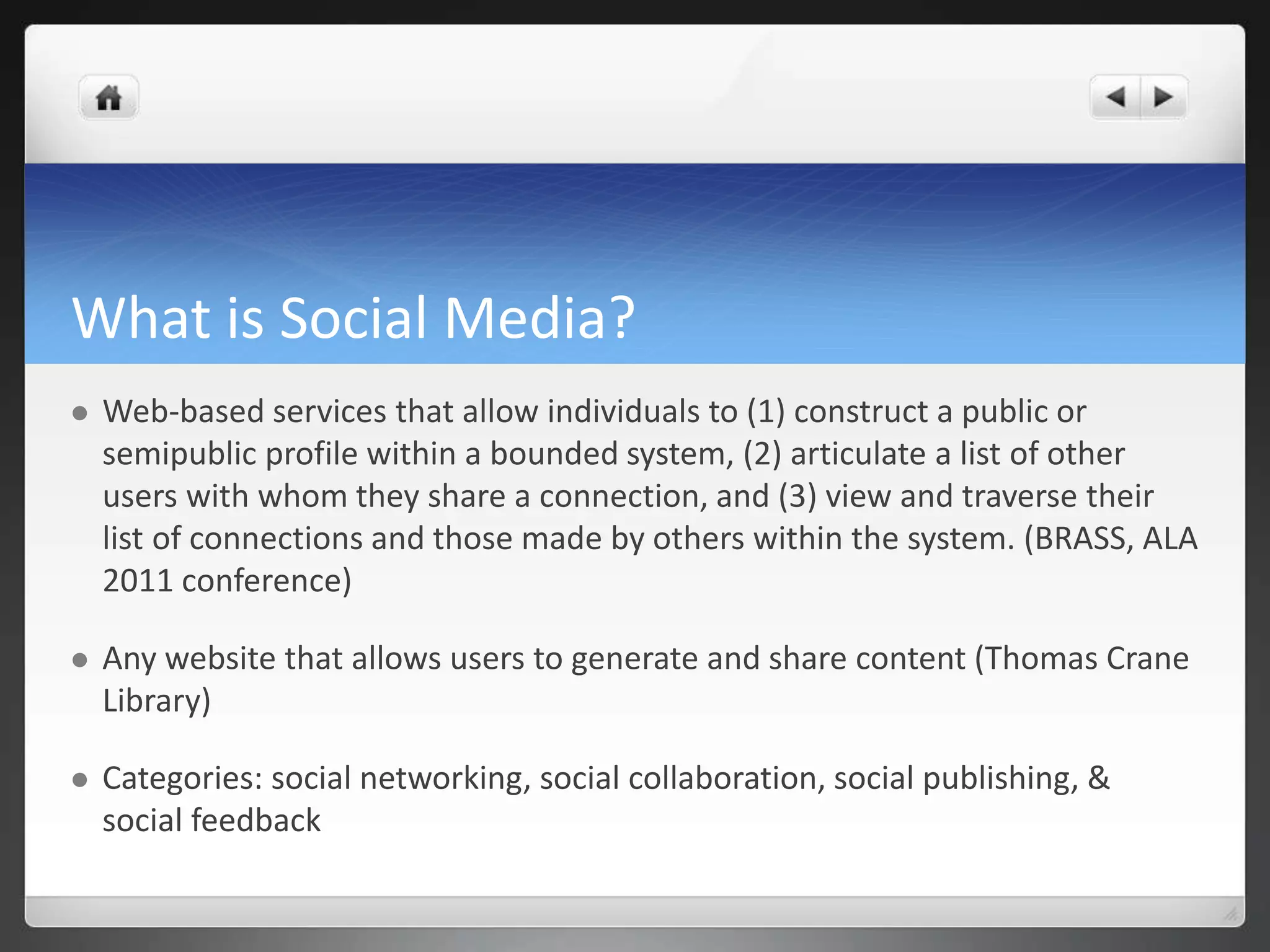 This document discusses the importance and use of social media in libraries. It defines social media as web-based services that allow users to generate and share content. The document notes that 51% of Americans use Facebook and social media is especially important for reaching younger demographics. It provides examples of how libraries use social media for outreach, community involvement, networking, and digital reference. Challenges and best practices for social media use are also discussed, including having a social media policy and plan in place before implementation.