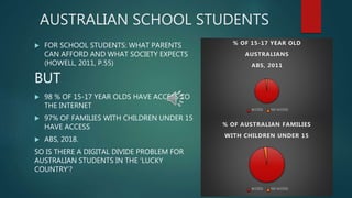 The document discusses the digital divide, which refers to unequal access to the Internet. While nearly all Australian students and families have Internet access, there remain educational inequalities related to socioeconomic status. Just providing access is not enough - what people access, how they use it, and how its benefits are shared also matter. Closing the digital divide requires addressing unequal participation and empowerment in education, society, and politics through Internet use. Teachers face challenges in developing digital expertise to help bridge educational gaps.