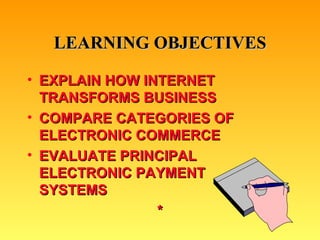 This document discusses how internet technology supports electronic business and commerce. It describes several internet business models, including virtual storefronts, marketplaces, auctions, and digital product delivery. It also compares categories of electronic commerce such as business-to-business, business-to-consumer, and consumer-to-consumer. Intranets and their applications in functions like finance, human resources, sales and supply chain management are also covered. The document concludes by examining challenges and opportunities of the emerging digital firm.
