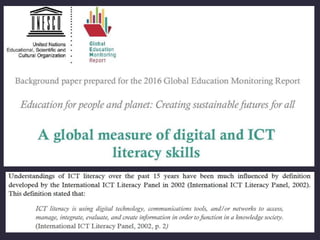 Professor Mark Brown and Dr Mairéad Nic Giolla Mhichíl from Dublin City University gave a presentation titled "The Digital Literacy Movement: Utopian or Dystopian Development?" There is no single definition of digital literacy and over 100 models exist. Current models are often too prescriptive and lack context. Digital literacies should be reframed to focus on critical thinking skills, participation in society, and shaping technology for positive social change rather than just skills development. The conclusion is that digital literacies are not on an independent trajectory and active citizenry is needed to help shape better digital futures for all.