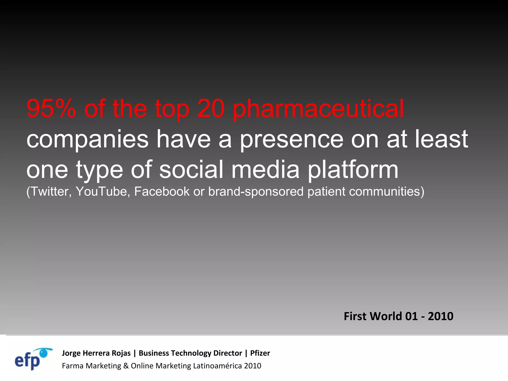 The document discusses the importance of online marketing for pharmaceutical companies in Latin America, highlighting that 95% of the top 20 companies utilize social media platforms. It outlines key actions for effective online marketing including research, publishing, and engaging with users. The text emphasizes the critical role of search engine marketing, social media, and e-public relations in distributing content and driving user interaction.