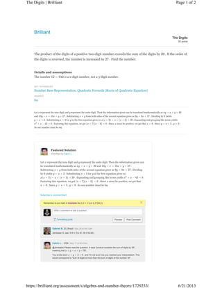 The problem states that the product of the digits of a two-digit number exceeds their sum by 39, and reversing the digits increases the number by 27. By representing the digits with variables x and y, two equations are formed and solved using algebra to obtain x=6 and y=9, so the number is 69.