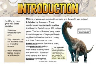 The document provides an overview of dinosaurs, detailing their existence over 160 million years and categorizing them into various groups such as ceratopsians and sauropods based on body shape and diet. It also highlights the Cretaceous period's environment and significant fossils while explaining the process of fossil discovery and preservation. Additionally, it includes interesting facts about dinosaurs and their characteristics.
