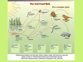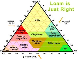 Soil is a mixture of minerals, air, water, and organic matter that supports plant growth. It consists of inorganic components like weathered rock and organic components like dead plants and animals. There are three main soil textures: sandy soil which has large particle spaces but poor water retention; silt which is finer than sand and prone to erosion; and clay which is very fine with tiny spaces and can become hard when dry. Loam is an ideal soil texture with a balance of particle sizes that allows for good aeration, water drainage, and nutrient retention to support plant growth. Maintaining healthy soil structure and avoiding compaction is important for plant health.