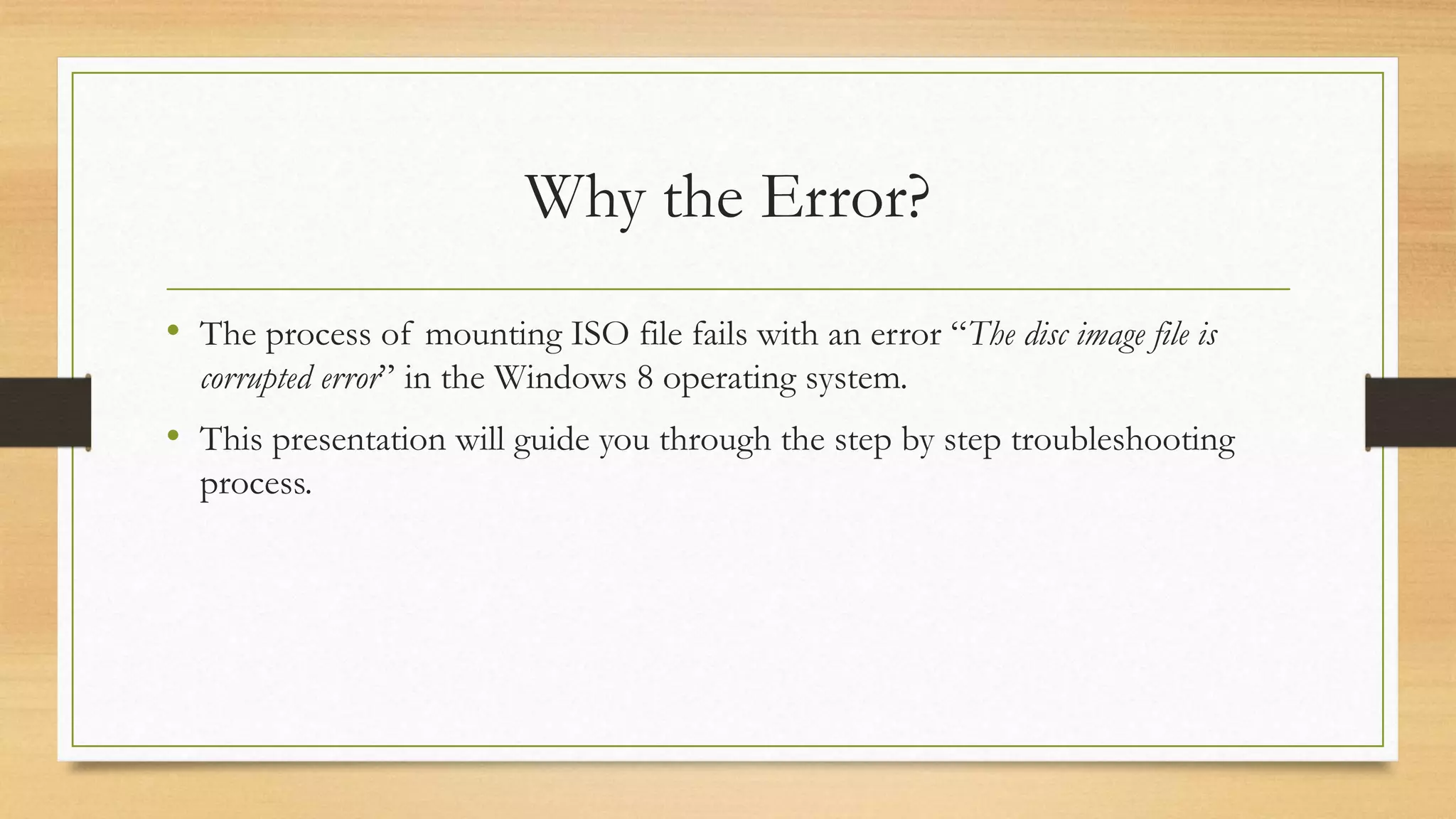 The document outlines troubleshooting steps for resolving the 'disc image file is corrupted' error in Windows 8, which can occur when mounting ISO files. Solutions include using a program uninstaller to clean up registry entries, checking disks for errors, cleaning physical discs, replacing the image disc, and redownloading the corrupted image file. Following these steps can help restore proper functionality to the system.