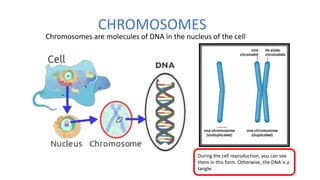 Chromosomes contain DNA and carry genetic information. DNA is made up of nucleotides that form a double helix structure. Genes are segments of DNA that code for specific traits. Humans have 46 chromosomes in most cells organized into 23 pairs. During cell division, the DNA duplicates so each new cell contains a full copy. DNA codes for proteins using a genetic code where three nucleotides correspond to a single amino acid. RNA is similar to DNA but contains one strand and uracil instead of thymine. It helps carry genetic instructions from DNA in the nucleus to the cytoplasm for protein production through transcription and translation.