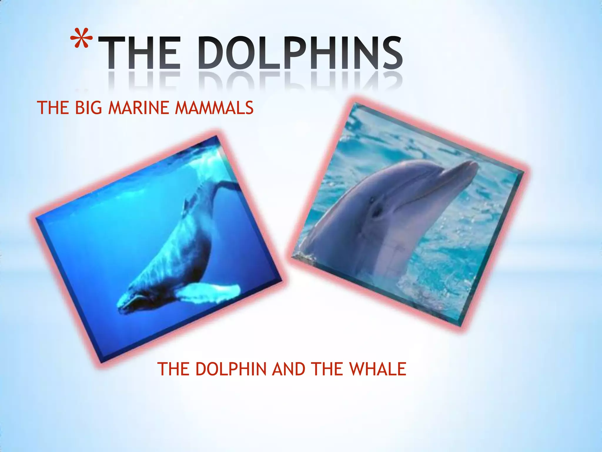 The document discusses characteristics of dolphins and whales. It notes that they are gray, big animals with large bodies, two flippers, a fin, and a long nose. They can swim very fast, jump, leap, play with people, catch fish, and communicate with each other. The document also provides more details about blue whales, describing them as the largest animal to ever live, filter feeders that eat plankton and krill. It notes blue whales can be heard from hundreds of kilometers away and live in every ocean, with their only predators being killer whales and humans.