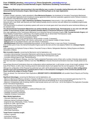 Synison Laboratory has developed an innovative transmission mechanism known as the Distributive Oscillating Transmission (DOT) that interconnects multiple coaxially rotating elements, optimizing mechanical efficiency for various applications, including advanced internal combustion and hybrid engines. The technology allows for programmable angular velocities and can perform complex thermodynamic cycles with high efficiency. The laboratory seeks licensing, technical cooperation, and manufacturing partners in relevant industries to commercialize the mechanism and its applications.