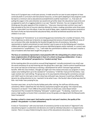 The document summarizes the goals and objectives achieved over 14 years at the Doyon School through their consensus-driven improvement process. Some of the major goals included establishing a set of shared working values to build positive relationships among staff, increasing consistency in curriculum and instruction between grades and classrooms, and maintaining a focus on developing and assessing high quality curriculum aligned to state standards. The process of setting goals and reviewing them annually helped transform the school culture from one of individual priorities to a collaborative, student-centered approach.
