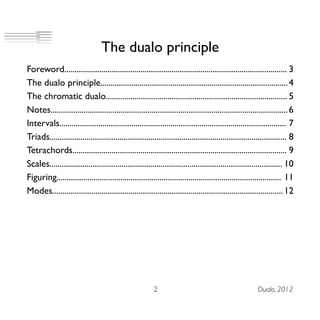 The document introduces the dualo principle, a new notation system that displays notes on a staff based on their relative pitch relationships as intervals of thirds. It uses traditional musical staves but shows successive thirds rather than absolute pitch. This allows chords, scales, intervals and other elements to be represented with distinctive shapes. The dualo principle was conceived in 2007 and forms the basis for a new musical interface called the du-touch.