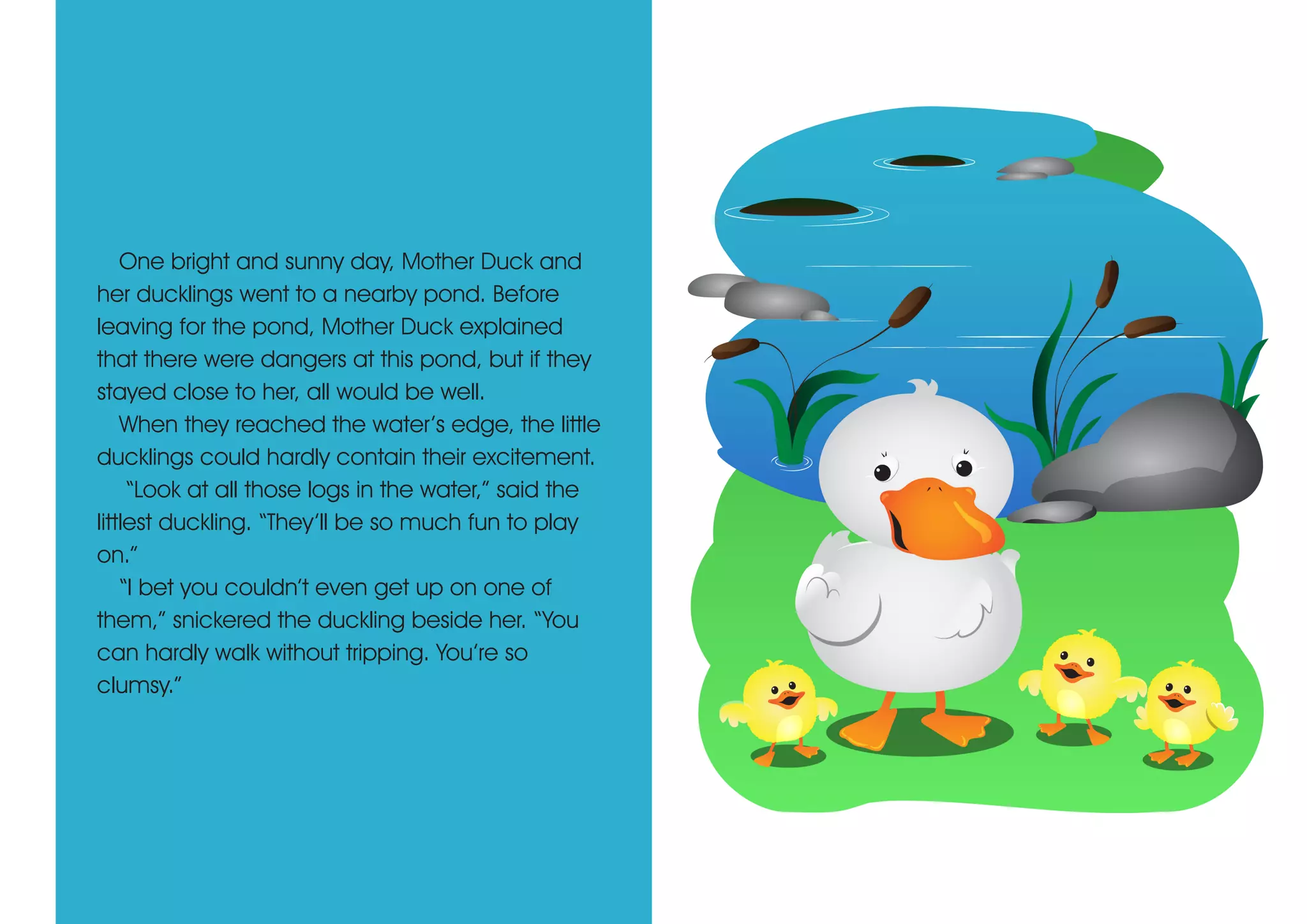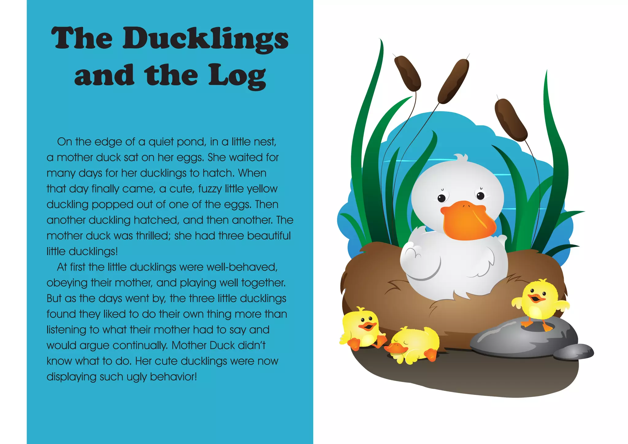 Mother duck sat on her eggs until three ducklings hatched. The ducklings began misbehaving and arguing. One day at the pond, two of the ducklings wandered towards a log and discovered it was actually a crocodile. They escaped but learned to obey their mother to stay safe. From then on, the ducklings listened to their mother and were happy.