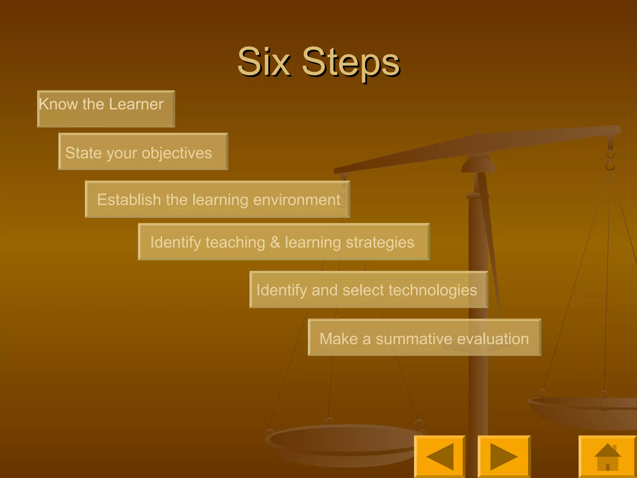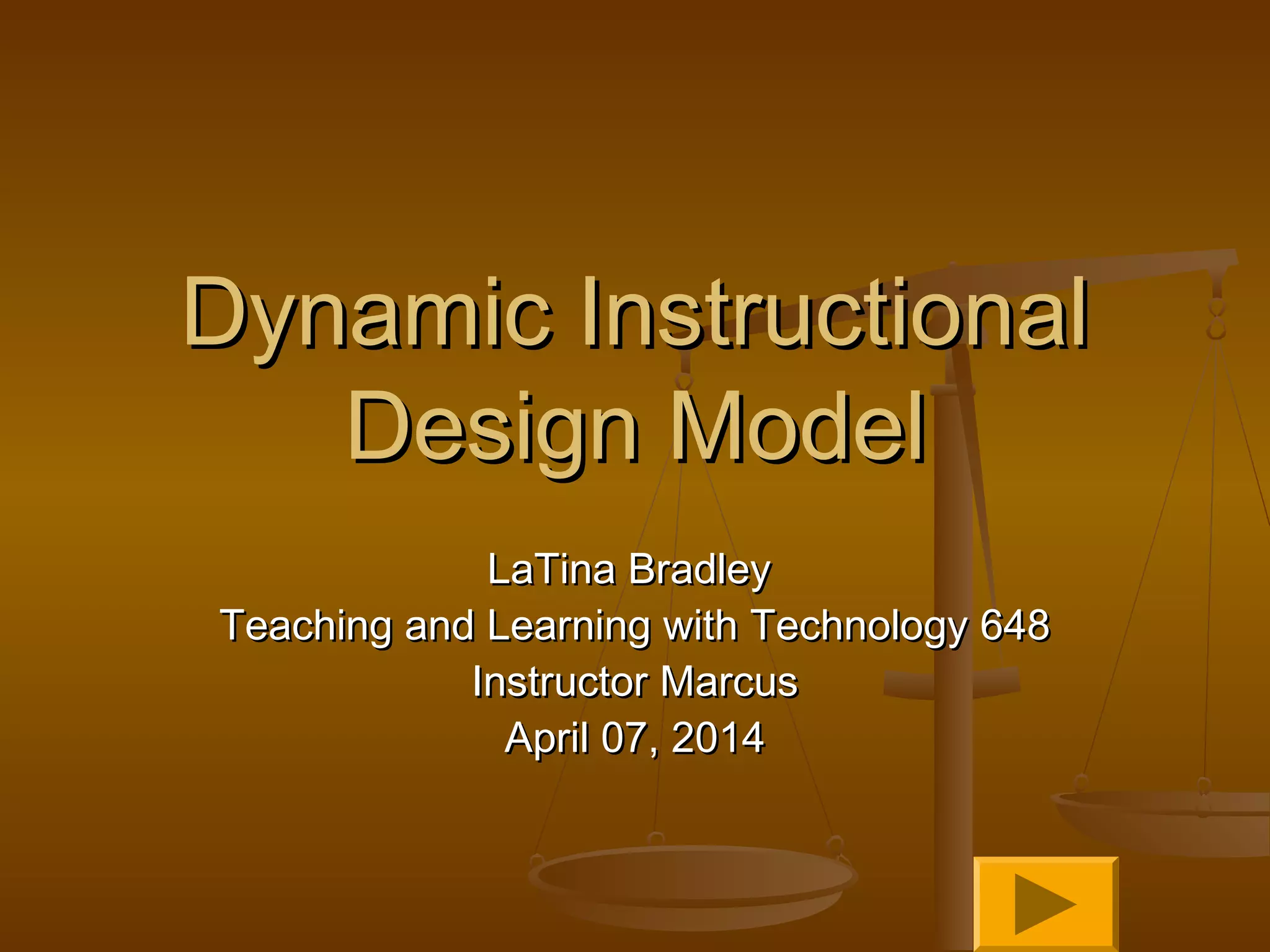 The document outlines a six step dynamic instructional design model: 1) Know the learner, 2) State objectives, 3) Establish the learning environment, 4) Identify teaching and learning strategies, 5) Identify and select technologies, 6) Perform a summative evaluation. It emphasizes understanding learner variations in abilities, culture, skills and individual characteristics. The objectives must specify what students will be able to do. Teaching strategies and appropriate technologies should be selected to help students achieve the objectives. Continuous evaluation and appropriate revisions are important to improve the design and ensure successful results.