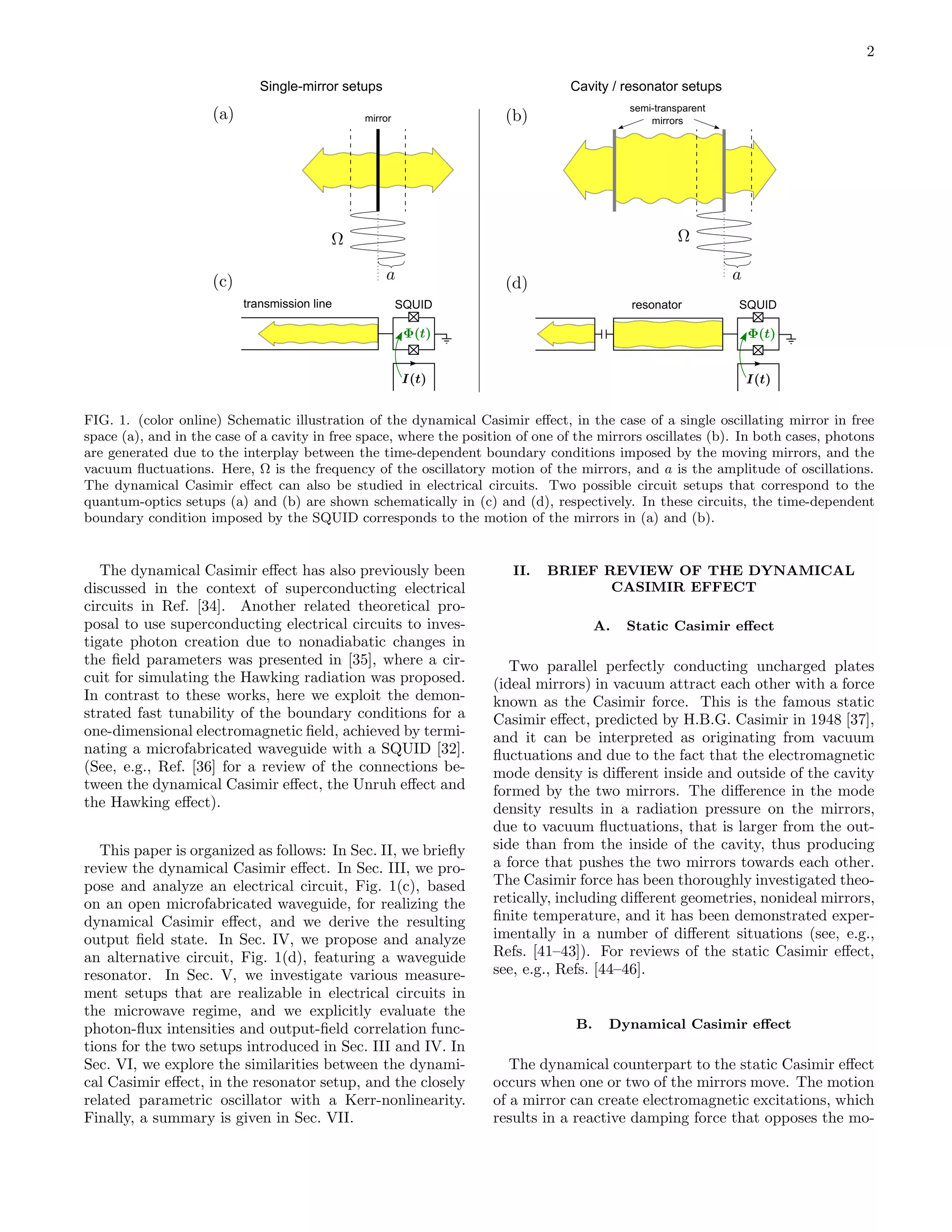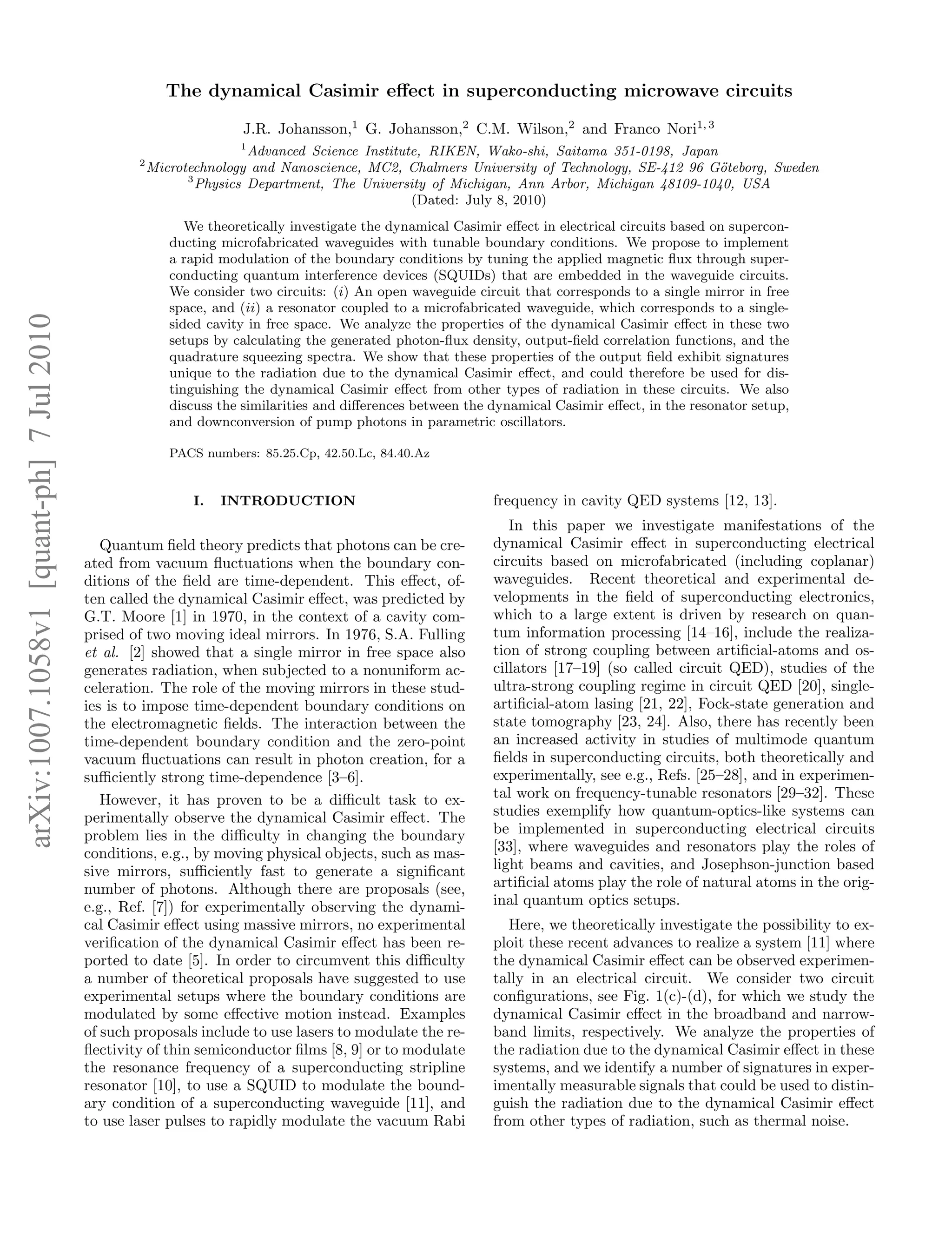 This document proposes investigating the dynamical Casimir effect in superconducting electrical circuits based on microfabricated waveguides. It describes two proposed circuit configurations: (1) an open waveguide circuit corresponding to a single moving mirror, and (2) a resonator coupled to a waveguide corresponding to a single-sided cavity. The document analyzes how photon flux, output field correlations, and squeezing spectra in these circuits could be used to distinguish radiation from the dynamical Casimir effect from other sources like thermal noise.