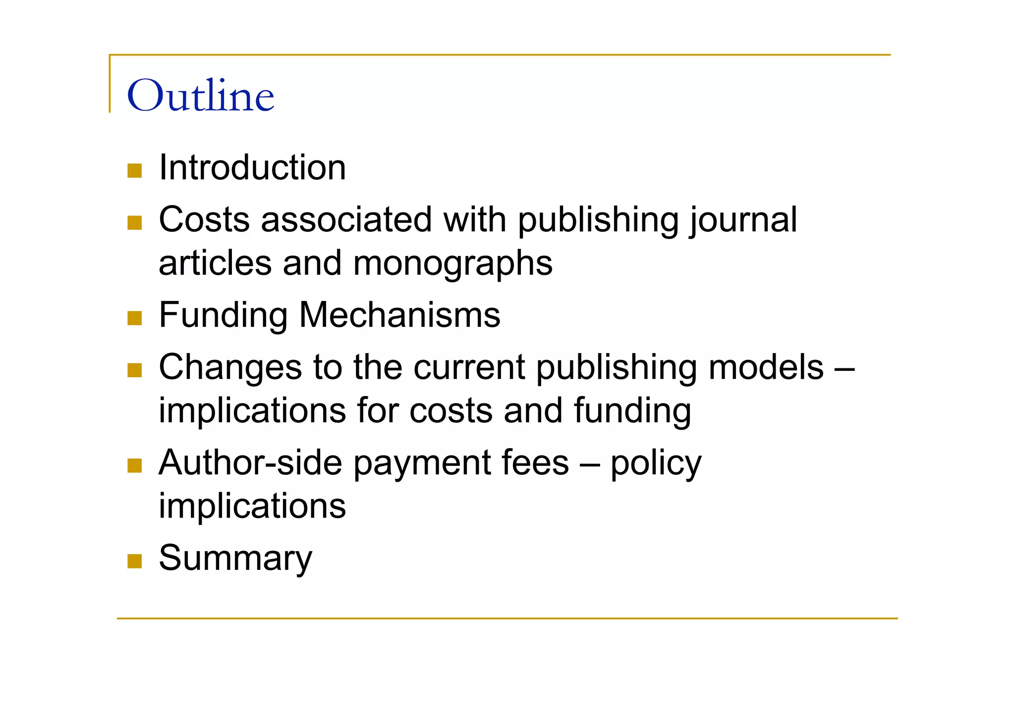 The document discusses the economics of open access publishing, detailing costs associated with publishing journal articles and monographs, funding mechanisms, and implications of changing publishing models. It highlights the potential cost savings and efficiency improvements from adopting author-side payment (the gold route) but notes significant challenges in funding transitions. The author emphasizes the importance of collaboration among researchers, institutions, and publishers to navigate these changes effectively.