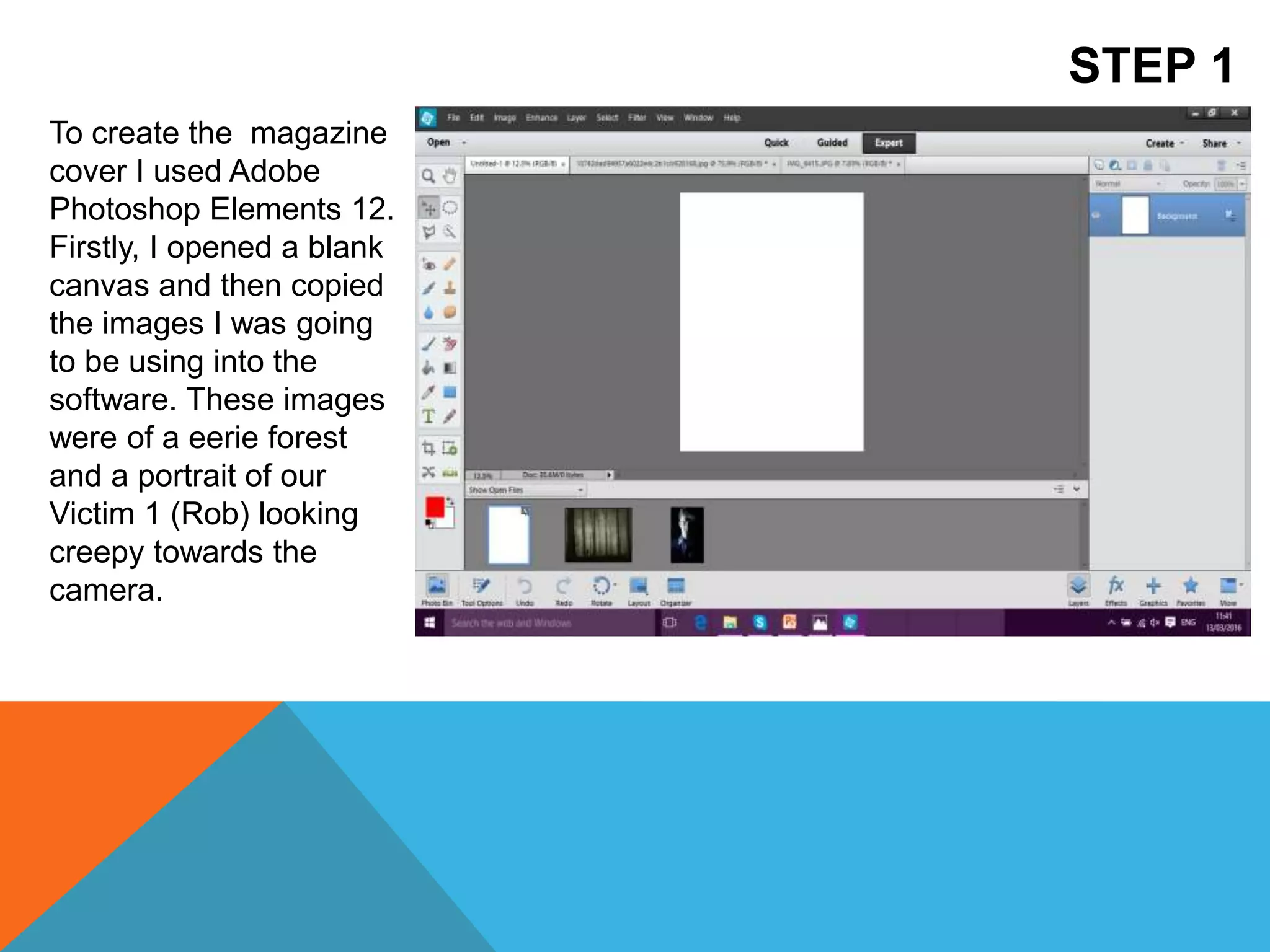 The document outlines the 7 step process for creating a magazine cover in Photoshop Elements 12 using images of a forest and a portrait subject. The steps include: 1) opening images in Photoshop, 2) resizing and positioning images, 3) removing background from portrait using layer mask and brush tools, 4) duplicating forest image and removing parts with mask, 5) adding cloud layer and adjusting opacity, 6) further removing parts of cloud layer with mask, 7) adding text elements like title and details using different fonts. The process resulted in a magazine cover with a horror theme incorporating the images and text.