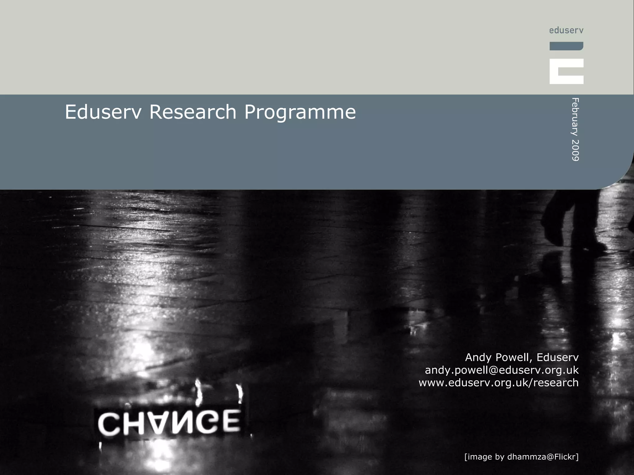 The Eduserv Research Programme aims to enhance engagement between Eduserv and the higher education community by retaining valuable activities while addressing previous issues such as funding and alignment. It focuses on internal research and pilot services to better inform and impact Eduserv's offerings, with planned studies on topics like web content management and cloud computing. Success will be measured by the programme's demonstrable influence on Eduserv services and contributions to the higher education sector.