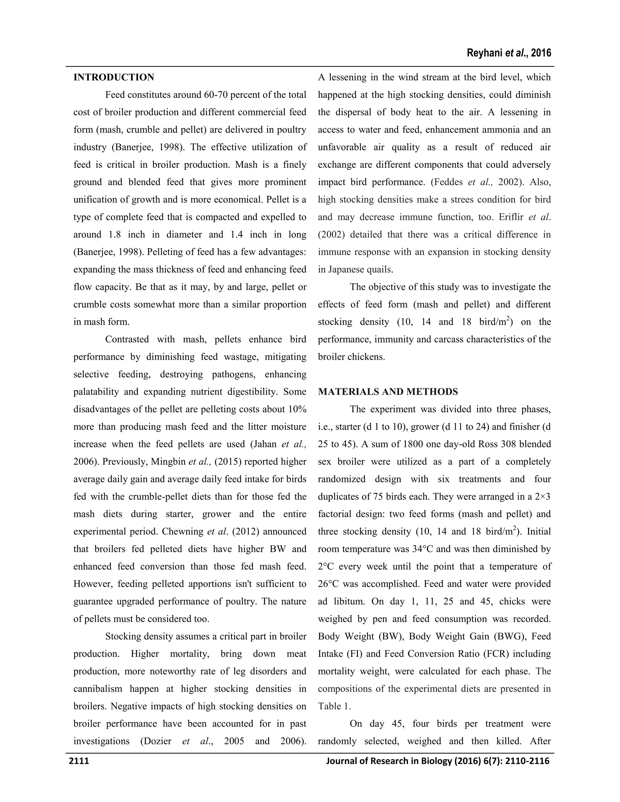 This study investigates the effects of different physical forms of feed (mash vs. pellet) and stocking densities (10, 14, 18 birds/m²) on the growth performance and immunity of Ross-308 broiler chickens. Results indicated that while pellet feed significantly improved body weight during the grower period, stocking density had a notable impact on feed intake, with higher densities resulting in decreased intake. Overall, feed form and stocking density had varying effects on broiler performance and carcass characteristics, but did not significantly influence immune response or carcass quality.
