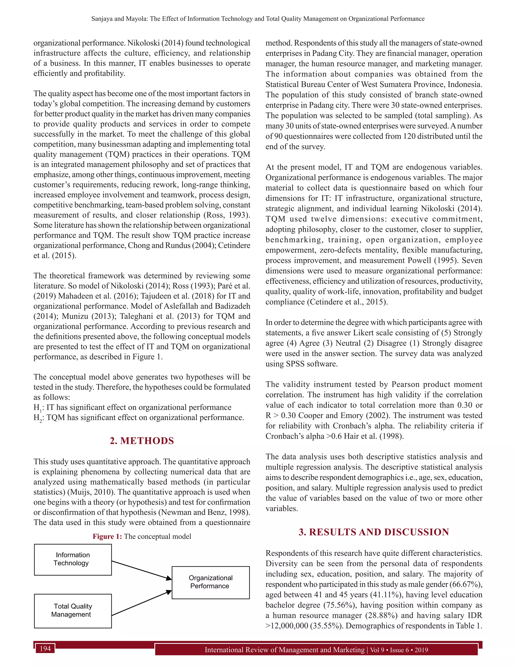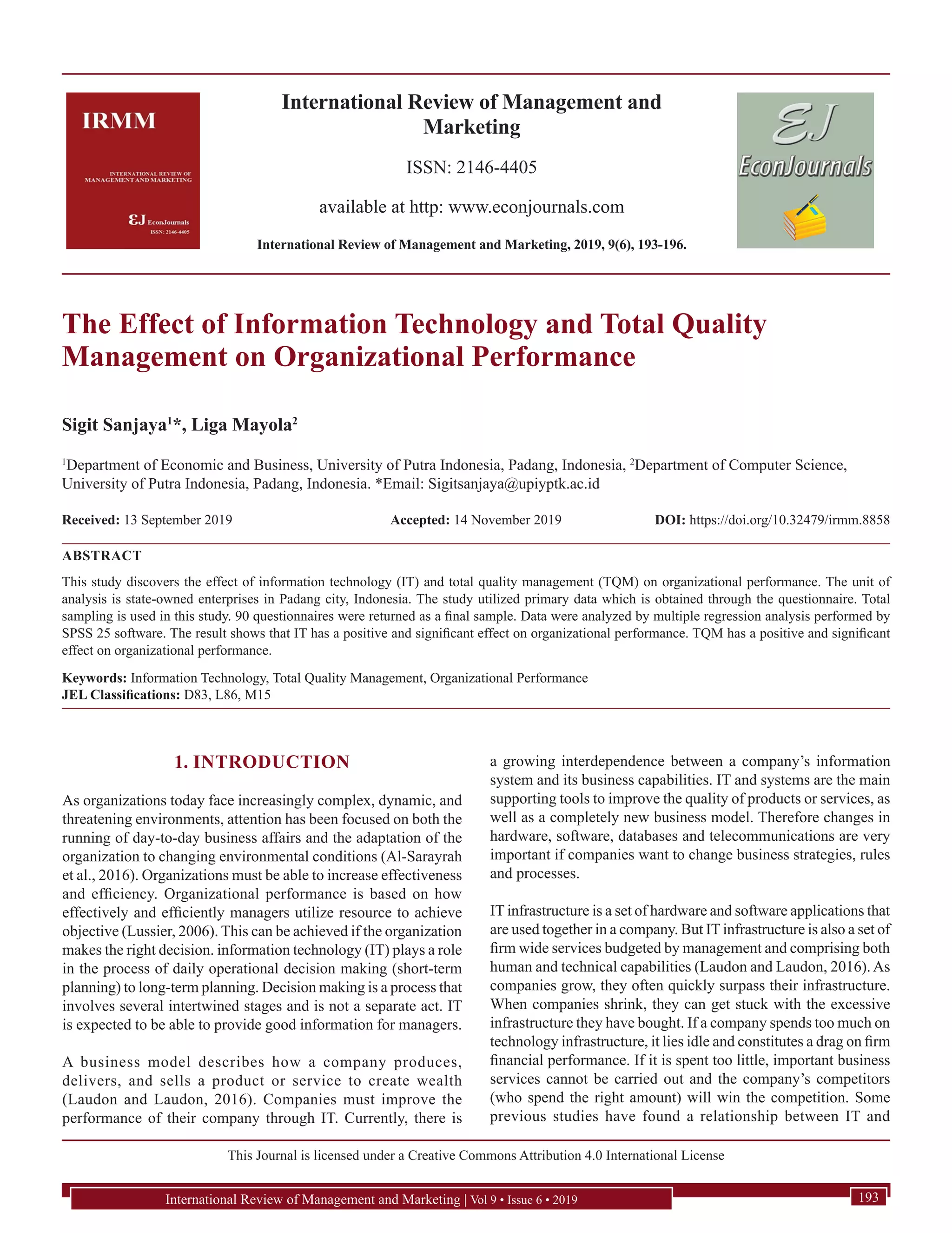 This study investigates the effects of information technology (IT) and total quality management (TQM) on the organizational performance of state-owned enterprises in Padang City, Indonesia, using a quantitative approach and data from 90 questionnaires. The findings demonstrate that both IT and TQM positively and significantly influence organizational performance, confirming the hypotheses that their implementation leads to improved efficiency, quality, and overall business results. The study highlights the necessity of integrating IT and TQM practices to enhance competitive advantage in a dynamic market environment.