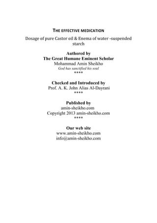 The document discusses the medicinal use of pure castor oil and water-suspended starch enemas, both advised by the prophet's medicine. It provides detailed dosage guidelines for castor oil across different age groups and instructions for its administration, alongside enema preparation and usage. The benefits of these treatments include effective cleansing of the digestive system and enhancing the body's immune response to illnesses.