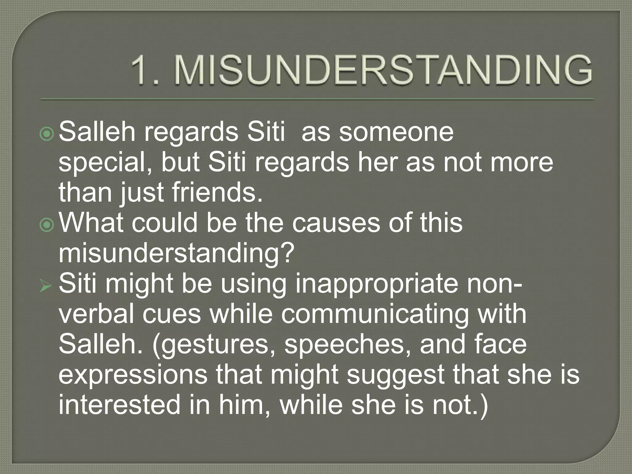 Siti regards her friend Salleh as just a friend, while Salleh regards Siti as someone special. This leads to a misunderstanding between them. When Salleh's family proposes to Siti's family, Siti's family rejects it by laughing at them. This causes an argument between the families. Due to the conflict and embarrassment, the families stop speaking to each other. Better communication could have prevented this misunderstanding and hurt feelings between Salleh, Siti, and their families.
