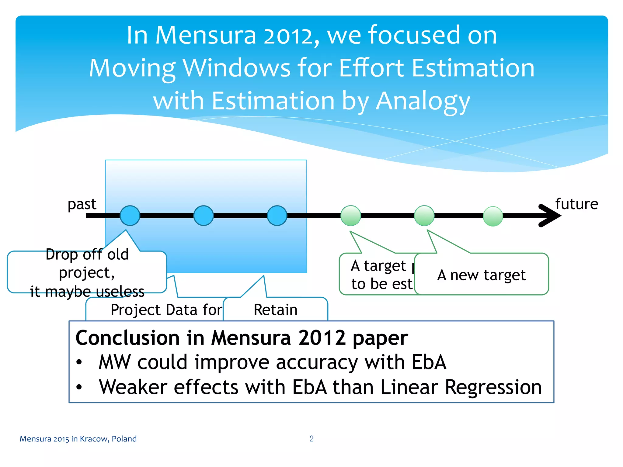 Fixed-size and fixed-duration moving windows were evaluated with estimation by analogy (EbA) effort estimation. With fixed-size windows, the modified EbA showed moving windows became significantly advantageous over the growing portfolio at medium window sizes, while trends were similar but ranges differed from past studies. With fixed-duration windows, moving windows improved accuracy less significantly than fixed-size windows over smaller window sizes. Comparisons with past studies found overall trends the same but effective window sizes and ranges differed.