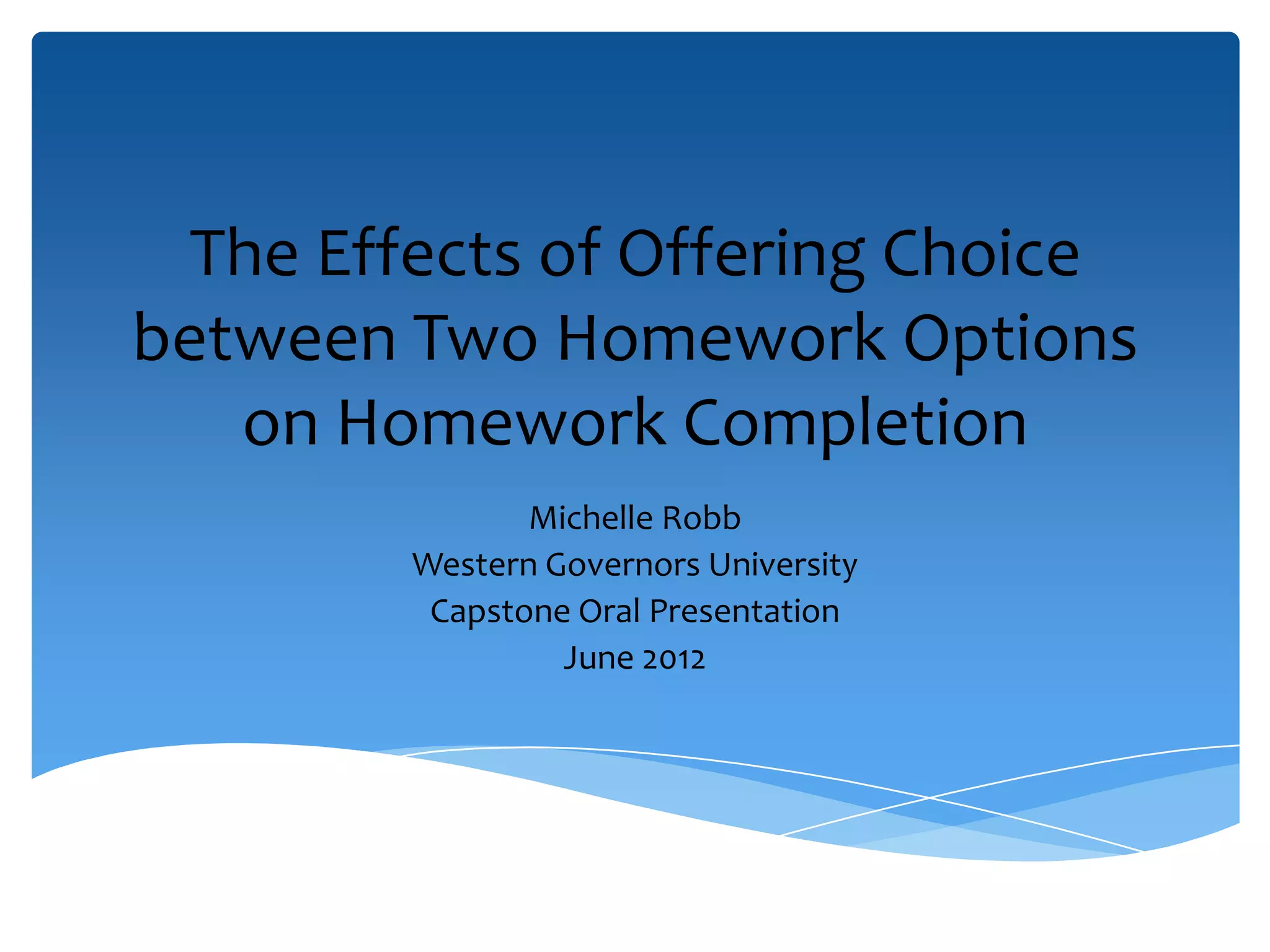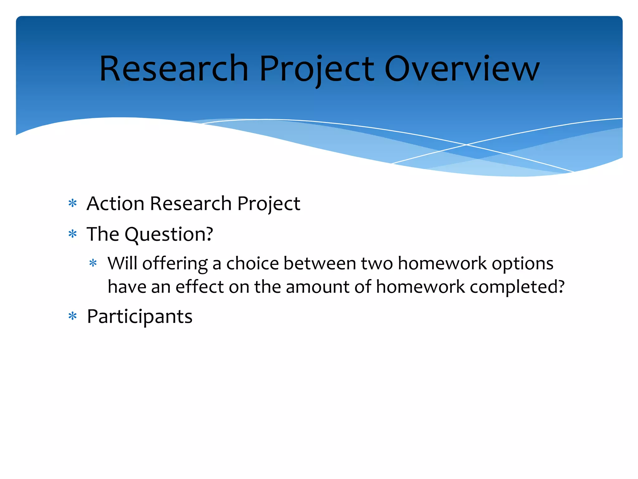 This document summarizes an action research project that examined whether offering students a choice between two homework options would increase homework completion rates. The researcher found that while students reported enjoying having a choice, quantitative data analysis showed no significant increase in homework completion. Most students reported forgetting or finding homework too difficult as obstacles to completing it, rather than a lack of motivation. Offering a choice may only affect the minority of students who find homework boring.