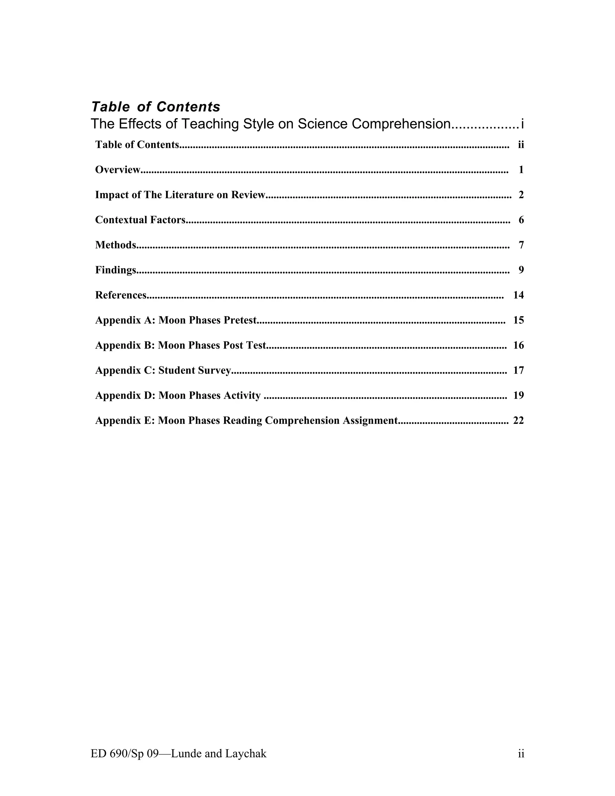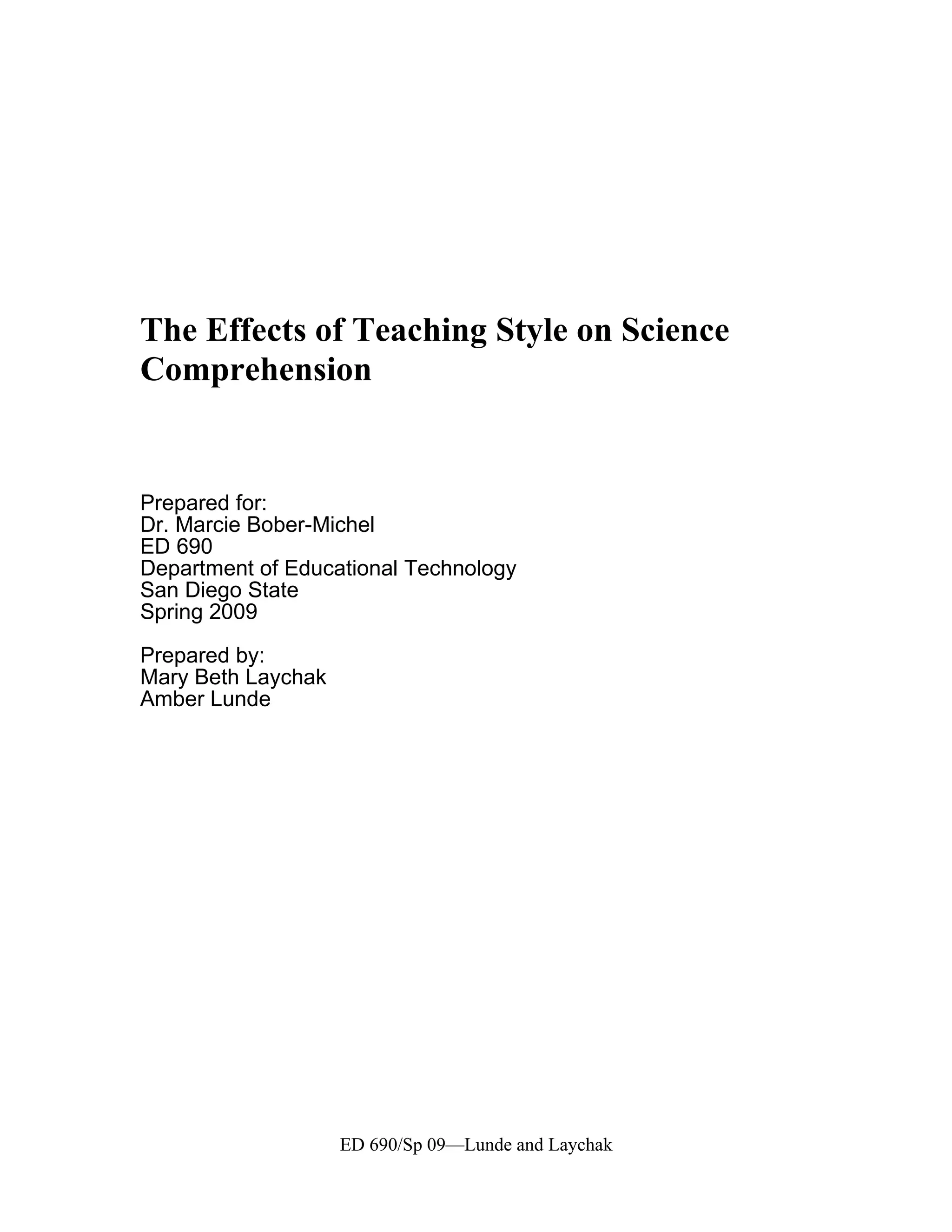 This study examined the effects of teaching style on 8th grade students' comprehension of lunar phases. Students were randomly assigned to either an experimental group that did a hands-on moon phase activity or a control group that completed a reading assignment. Both groups were given a pre-test and post-test, as well as a survey on their experience. The study found that students who did the hands-on activity scored higher on the post-test and generally had a more positive view of the instructional method. The results suggest hands-on learning may be more effective for teaching science concepts compared to traditional textbook and worksheet approaches.