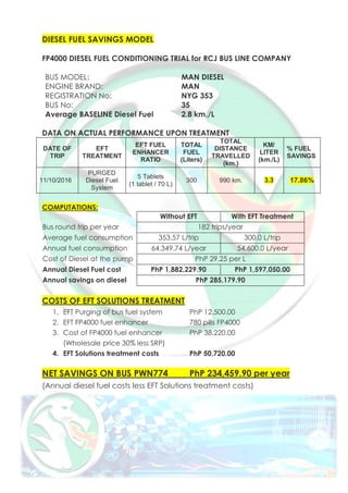 The document discusses the efficacy of the FP4000 diesel fuel conditioner in improving fuel economy, reducing emissions, and extending engine life for two bus companies in the Philippines. Trials indicate substantial savings in fuel consumption and costs, with one company saving approximately PHP 285,179.90 per year and the other PHP 374,026.94, after accounting for the costs of the fuel treatment solutions. Additionally, it addresses the pollution caused by diesel engines and outlines the benefits of using EFT products to enhance engine performance and protect the environment.