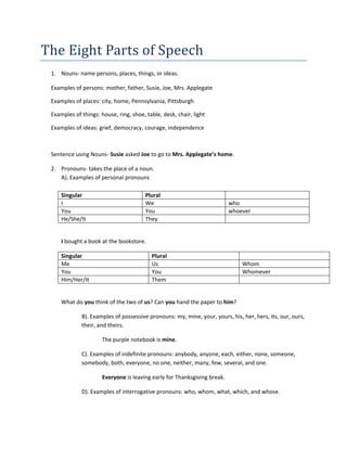 The document defines and provides examples of the eight parts of speech: nouns, pronouns, verbs, adverbs, adjectives, prepositions, conjunctions, and interjections. Nouns name people, places, things, or ideas. Pronouns take the place of nouns. Verbs express actions or states of being. Adverbs describe verbs. Adjectives describe nouns. Prepositions show relationships between words. Conjunctions link words and phrases. Interjections show emotion.