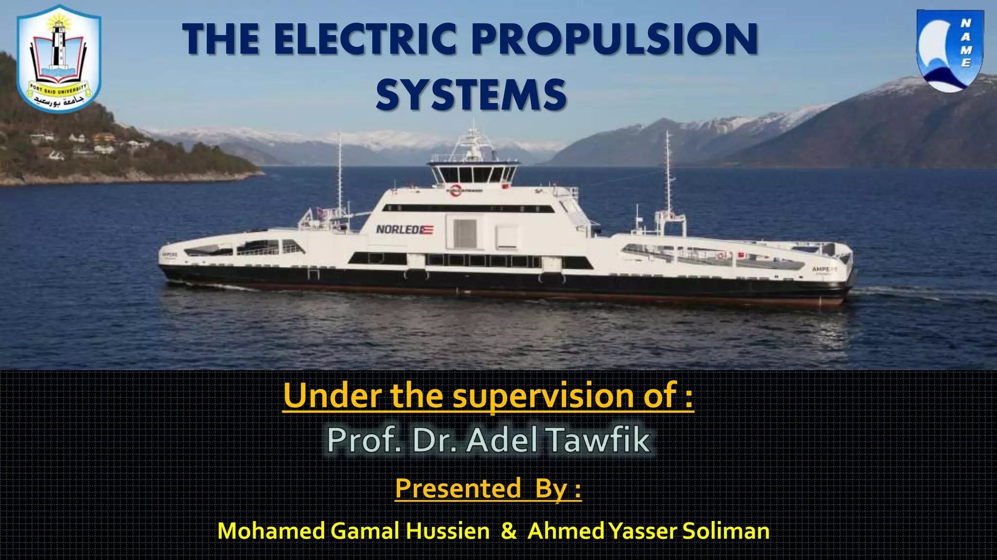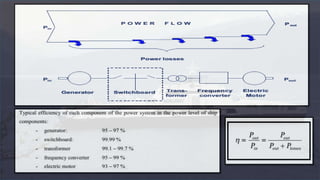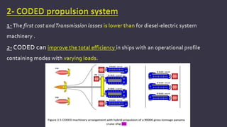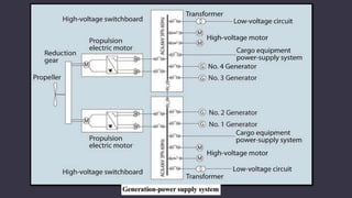 The document discusses electric propulsion systems for marine vessels. It provides an overview of conventional power plants and their disadvantages. It then discusses the history and development of electric propulsion systems, including early experimental systems from the late 19th century through modern commercial applications starting in the 1920s. The document outlines several types of electric propulsion systems and their components. It discusses the advantages of electric propulsion systems, including improved efficiency, emissions reductions, and operational flexibility compared to conventional systems.
