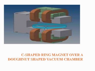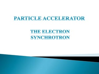 A synchrotron uses a cyclic particle accelerator to accelerate charged particles to very high energies using alternating electric and magnetic fields. The first electron synchrotron was constructed in 1945 by Edwin McMillan at the University of California, designed for energies between 320-350 MeV. A synchrotron consists of an electron gun, linear accelerator, booster ring, storage ring, beamline, and end station to produce and direct beams of synchrotron light for applications in spectroscopy, crystallography, medical imaging, and cancer therapy.
