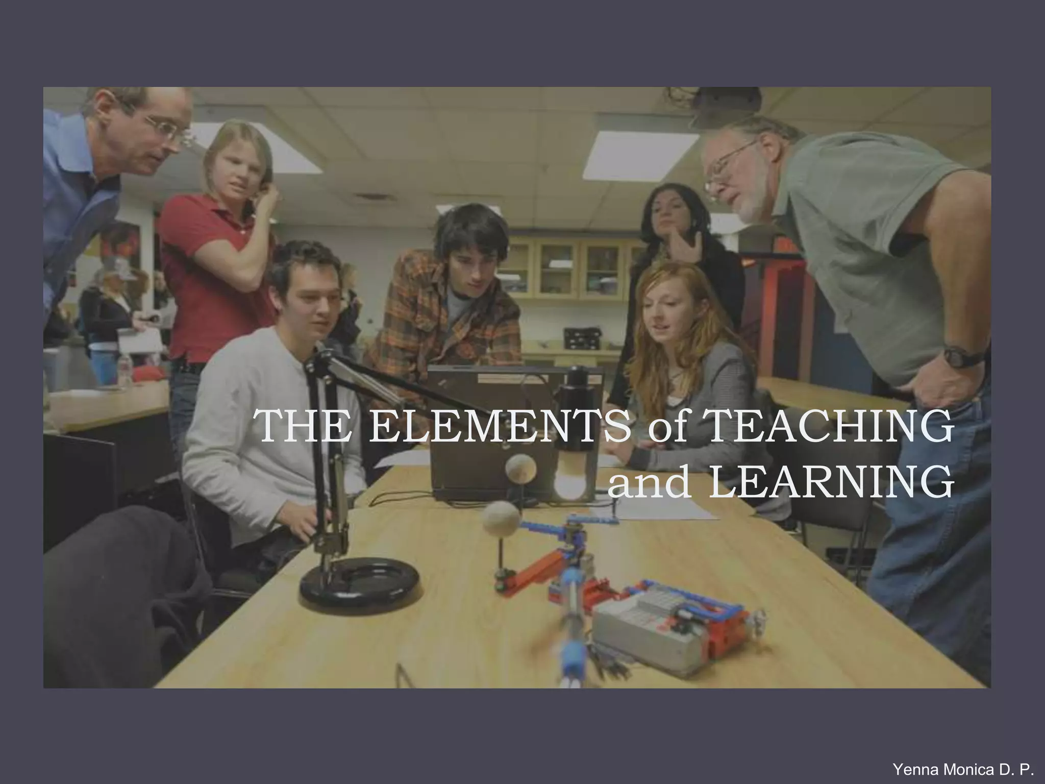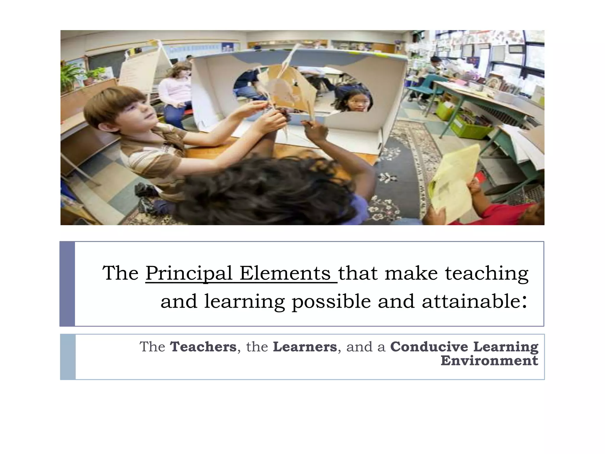 The document outlines the essential elements of teaching and learning, focusing on the roles of teachers, learners, and the learning environment. It discusses the various attributes and influences that impact learners, including their abilities, interests, and backgrounds, as well as the teachers' professional and personal attributes that foster effective teaching. Additionally, it emphasizes the importance of a conducive learning environment, characterized by proper physical arrangements, positive interactions, and support for individual learning styles.