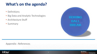 The document discusses big data analytics in the cloud, including definitions of big data and analytics. It covers technologies like Hadoop, Dremel, and Storm, and how they can be used for business intelligence, operational intelligence, and value creation. It also discusses architecture considerations for big data analytic systems in the cloud, including data transfer speeds. The presentation aims to provide an overview of approaches for near real-time business intelligence and analytics using these technologies, both their applicability and limitations when used in the cloud.