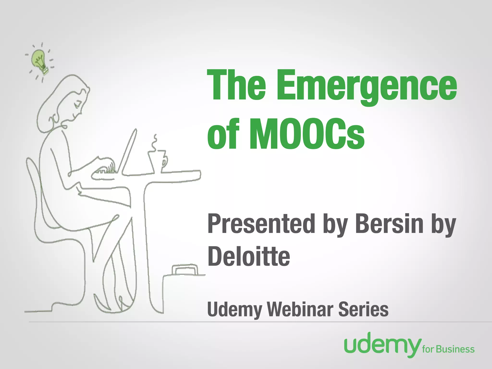 The document discusses the role and potential impact of Massive Open Online Courses (MOOCs) in corporate training, highlighting their characteristics, current adoption rates, and future applications. It reveals that while many organizations express interest in exploring MOOCs for learning and development, actual usage remains limited due to various barriers such as familiarity, content relevance, and integration challenges. The presentation emphasizes the need for organizations to understand and adapt to the evolving MOOC landscape to leverage their benefits effectively.