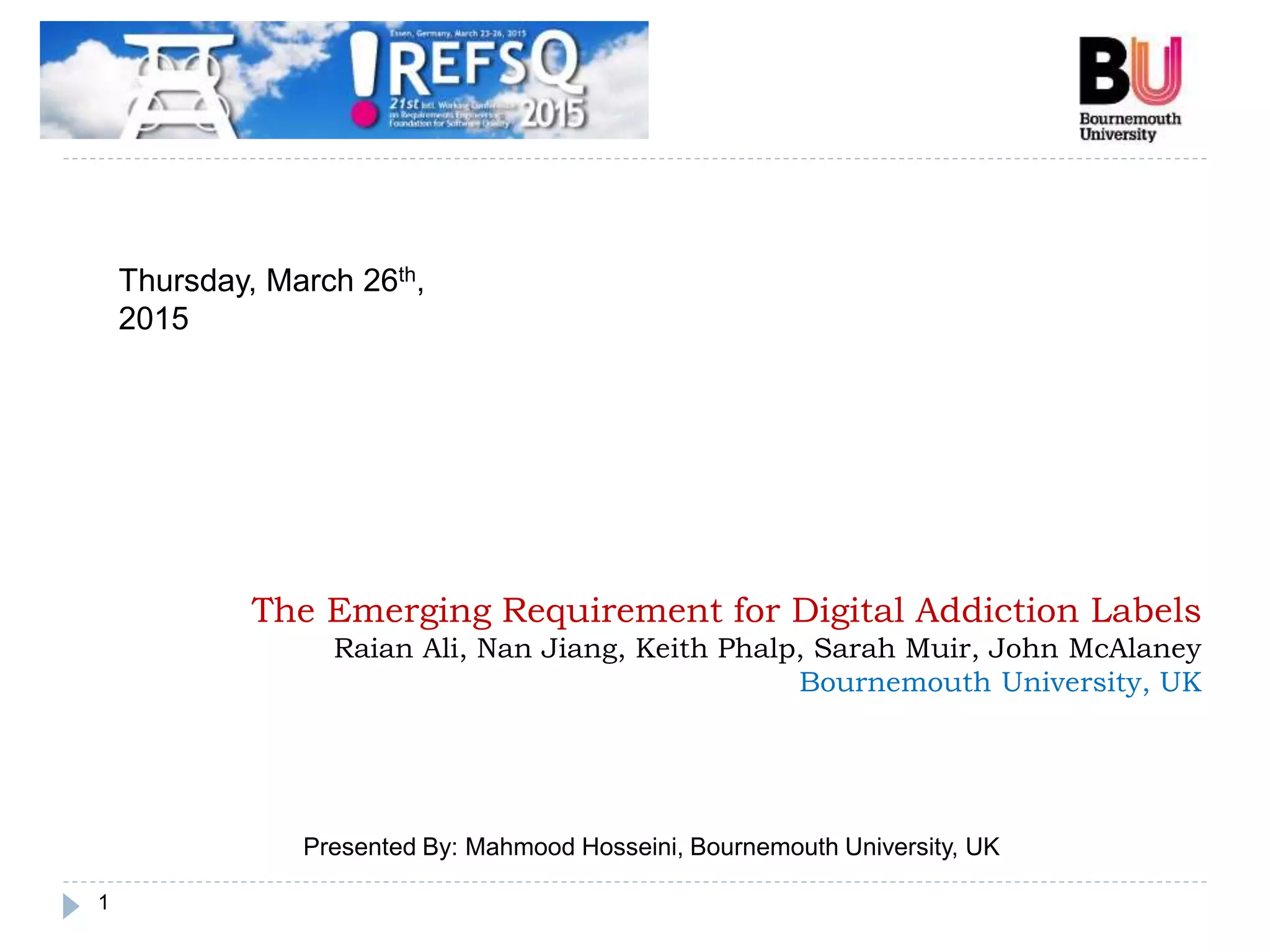 The document discusses the necessity of addressing digital addiction (DA) as a significant issue in software development, similar to traditional addictions like drugs and gambling, which have established guidelines and policies. A study revealed the negative psychological effects of DA on users, highlighting symptoms like withdrawal and social isolation. The authors advocate for the implementation of digital addiction labels to raise awareness and promote healthier software usage, while exploring user preferences for the content and presentation of these labels.