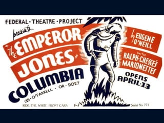 This document provides a detailed summary of the play The Emperor Jones by Eugene O'Neill. It describes the plot, characters, themes, and context of the play. Specifically, it discusses that the play tells the story of Brutus Jones, a former train porter who becomes the emperor of a Caribbean island but must escape into the jungle during a revolution. As he navigates the forest, he experiences haunting hallucinations from his traumatic past. The themes explored include the impact of past trauma, the legacy of slavery, racism, the fall of a corrupt ruler, and Jones as a tragic hero.