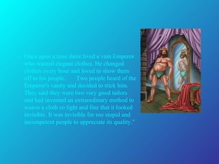 Two tricksters convince a vain emperor that they can weave clothes that are invisible to those who are unfit for their positions. They pretend to weave the clothes but produce nothing. The emperor parades before his subjects in his "new clothes" afraid to admit that he sees nothing. A child finally exclaims that the emperor has no clothes on, starting a realization among the people that the emperor is indeed naked.