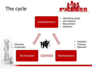 The employment cycle involves 3 stages: 1) Establishment where organizations identify staffing needs, conduct job analysis, recruit applicants, and select candidates. 2) Maintenance through induction, training, skills tracking, pay/benefits. 3) Termination of voluntary resignations or retirements, and involuntary dismissals or layoffs. The cycle helps organizations align employment with business strategy over time through planning, attracting talent, developing skills, and managing turnover.