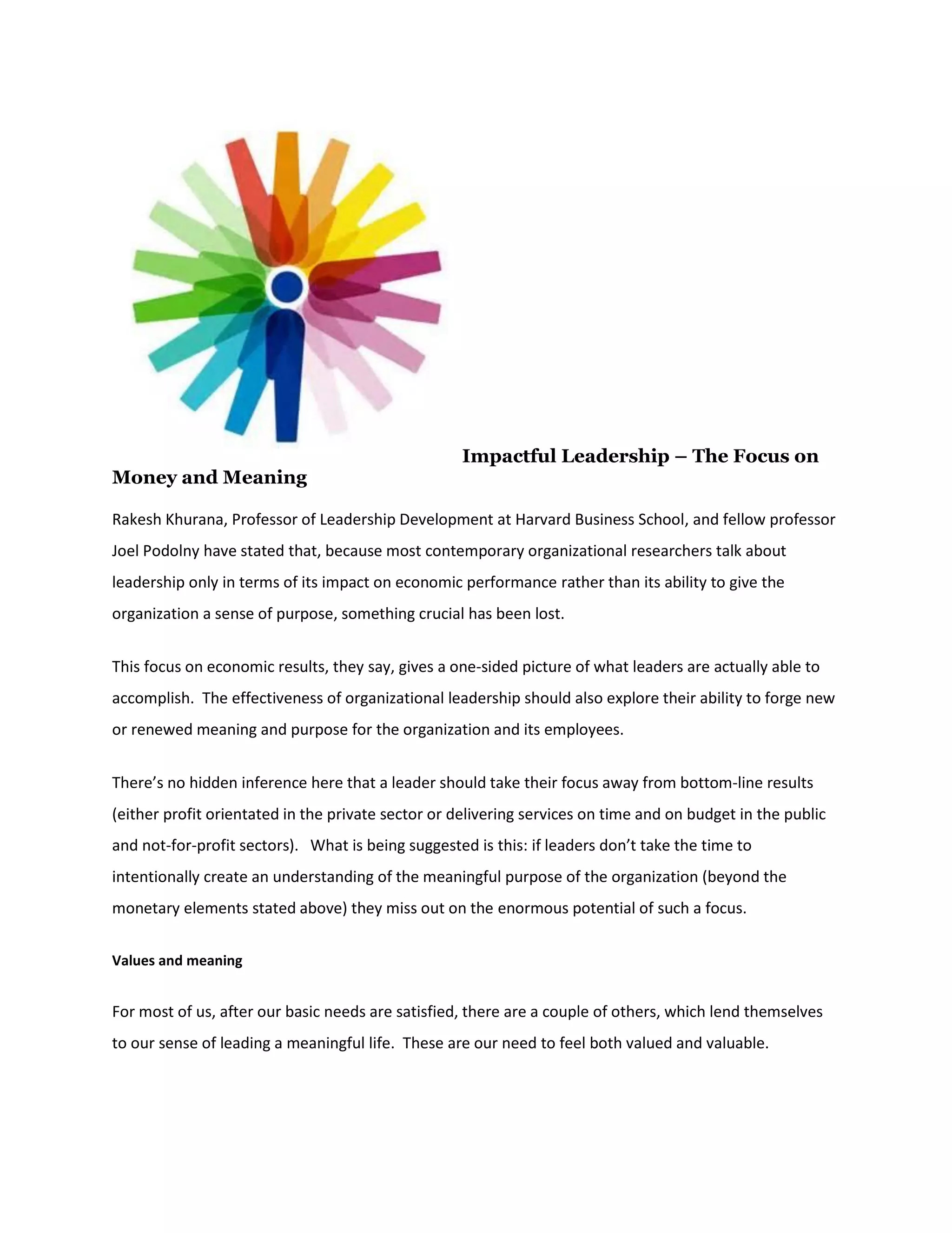 Two Harvard professors argue that leadership is often discussed only in terms of economic performance rather than purpose. This narrow focus misses leadership's ability to forge meaning and purpose for an organization. While economic results are important, leaders should also focus on intentionally creating an understanding of the organization's meaningful purpose beyond money. Doing so allows leaders to tap into employees' needs to feel valued and valuable through aligning their values with the organization's goals and ideals.