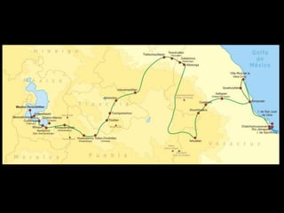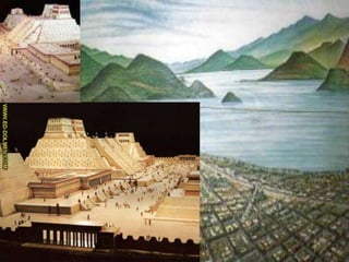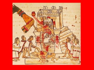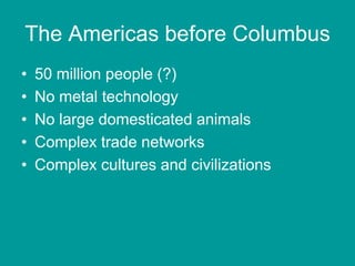 The document discusses the Americas before Columbus, including that there were over 50 million indigenous people with complex cultures and trade networks but no metal technology or large domesticated animals. It then focuses on the Aztec Empire, describing them as skilled warriors who conquered surrounding peoples and captured enemies for sacrifice. It notes that Hernan Cortes conquered the Aztecs by 1521 with the help of native allies and the smallpox epidemic. The document also briefly discusses Moctezuma II, the Aztec ruler held prisoner by the conquistadores, and the Columbian Exchange that resulted from contact between the Old and New Worlds.