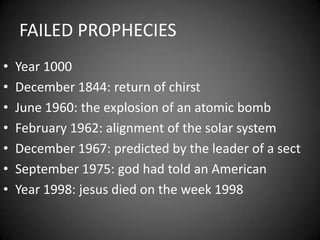 The document lists several failed prophecies about the end of the world from religious leaders and pseudoscientists between the years 1000 and 2000. It then outlines various predicted apocalyptic events between 2012 and 2060 related to natural disasters, warfare, climate change, aliens, machines, and zombies. It concludes by asking the reader if they think the end is near based on these many end times predictions.