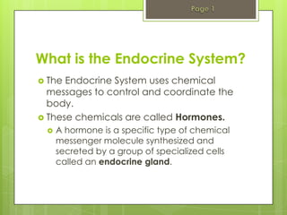 The endocrine system uses hormones to control and coordinate the body's functions. Hormones are chemical messengers released by endocrine glands directly into the bloodstream. The major endocrine glands include the hypothalamus and pituitary gland, thyroid gland, pancreas, adrenal glands, and gonads. These glands regulate critical body processes like metabolism, growth and development, reproduction, and stress responses.