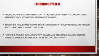 The endocrine system regulates body activities through hormones secreted by endocrine glands, which interact closely with the nervous system. Hormones have five major functions including metabolic regulation, transport assistance, and roles in reproduction and development, with distinct action mechanisms for protein and steroid hormones. Key endocrine organs include the pituitary, thyroid, adrenal glands, and pancreas, each responsible for specific hormone production and regulation of physiological processes.