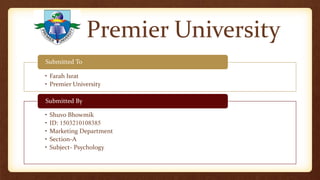 This presentation introduces Farah Israt from Premier University and their presentation on the endocrine system submitted to Shuvo Bhowmik in the marketing department. The presentation discusses the endocrine system, which is the body's chemical messenger system that includes glands like the pituitary, thyroid, parathyroid, adrenals, pancreas, ovaries, and testes. These glands secrete hormones into the bloodstream that are carried throughout the body. The presentation provides an overview of some major glands in the endocrine system.