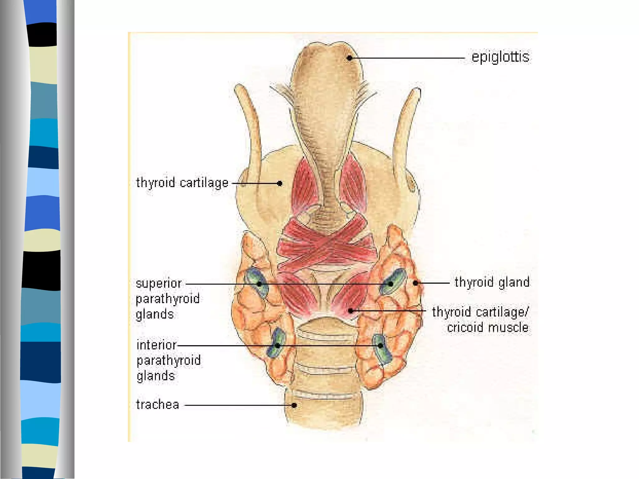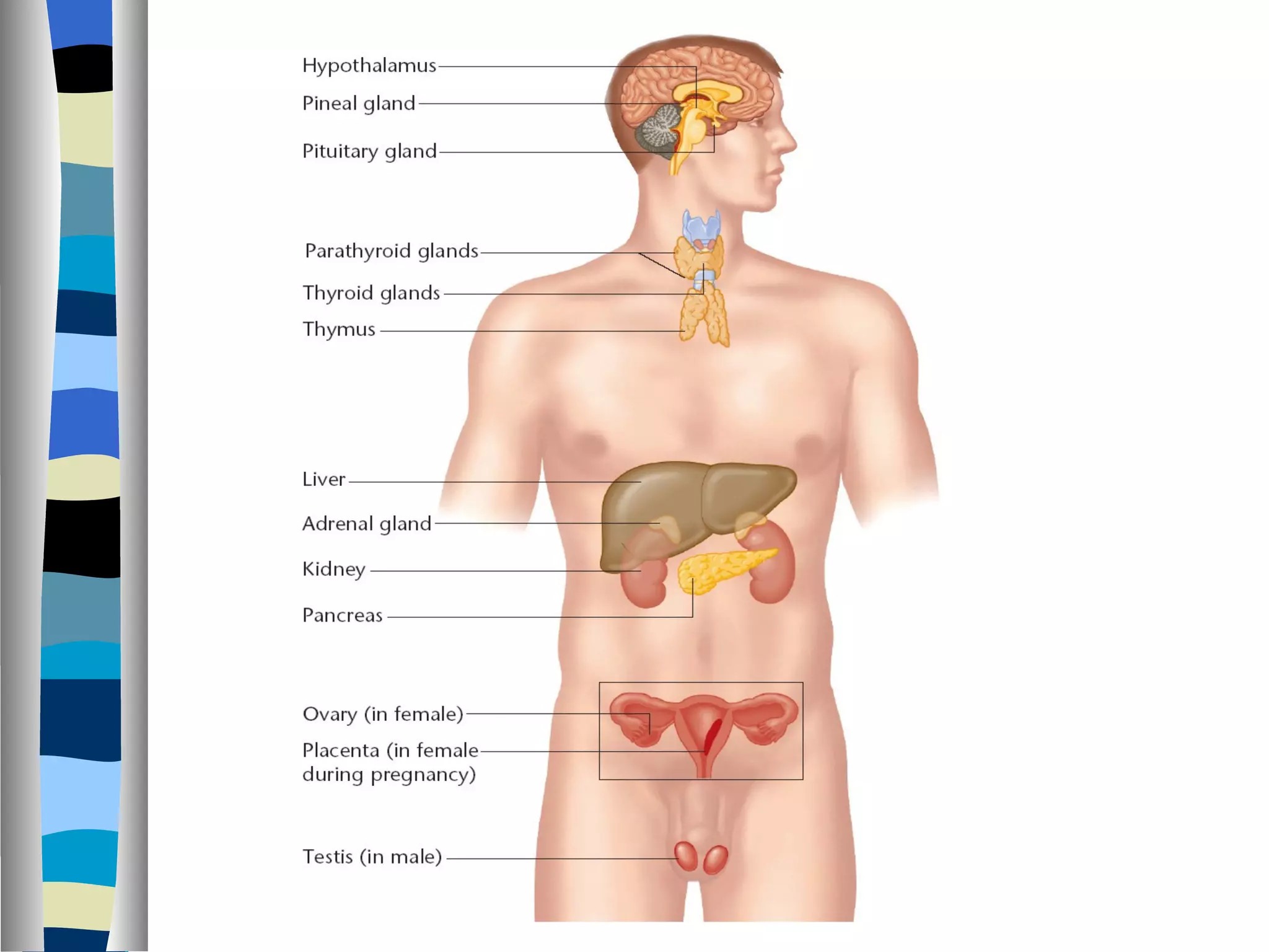 The endocrine system is made up of glands that produce hormones. The pituitary gland, called the "master gland," controls many of the other endocrine glands and produces several important hormones. Other major glands include the thyroid, which produces hormones that regulate metabolism, the adrenals, which produce hormones such as adrenaline, and the ovaries and testes, which produce sex hormones like estrogen and testosterone. Each endocrine gland releases different hormones that target various tissues and organs to regulate many essential body functions.