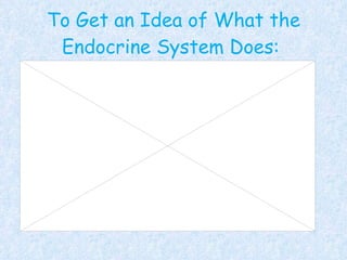 The endocrine system is made up of several glands that produce hormones to regulate bodily functions. The pineal gland located in the brain produces melatonin which controls sleep cycles. The hypothalamus located in the brain sends hormones that control functions like sleep, eating, and temperature. The pituitary gland is called the "master gland" as it controls other glands and regulates growth and development. Other glands include the thyroid which regulates metabolism, the pancreas which controls blood sugar, and the gonads like the ovaries and testes which produce hormones related to development and reproduction.