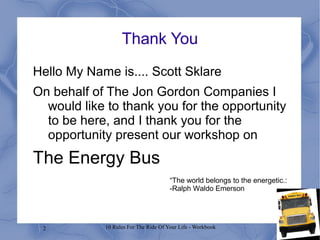 The document outlines a workshop based on Jon Gordon's book 'The Energy Bus', focusing on ten rules to enhance personal and organizational energy and productivity. Key objectives include identifying individual and team purposes, improving communication, and fostering a positive culture while addressing challenges. The workshop emphasizes the importance of being proactive, setting a vision, and maintaining positive energy in pursuing goals.