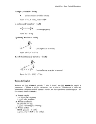 This document discusses the English verb system and the differences between tense and aspect. It explains that tense refers to objective time while aspect reflects the subjective view of time. There are 3 tenses - present, past, future - and 4 aspects - simple, continuous, perfect, perfect continuous. The combination of tense and aspect results in 12 verb forms. The document provides examples of each verb form and explains how the sequence of tenses rule determines the tense used in subordinate clauses. It includes a diagram of the English verb system to illustrate the relationships between tenses.