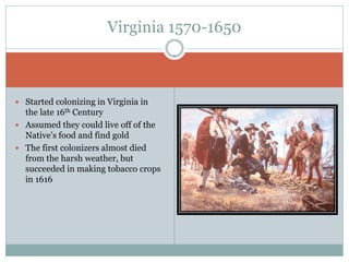 The English started colonizing Virginia in the late 16th century, establishing Jamestown in 1607. The early colonists struggled to survive the harsh conditions and almost died out until they began growing tobacco crops in 1616. To survive, the English established plantations worked by slaves and traded furs with Native Americans through companies like the Hudson's Bay Company. This colonization by the English eventually led to tensions that caused the American Revolution and independence from England in 1783.