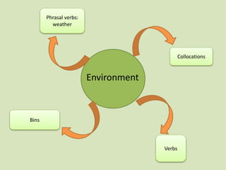 This document discusses environmental topics including weather, bins, and verbs related to the environment. It provides common collocations for weather such as "to clear up" and "to cloud over" and lists categories for waste bins. Several verbs are defined that relate to being environmentally conscious such as "to be green," "to waste," "to save," "to reuse," "to recycle," "to throw away," "to get rid of," and "to pollute."